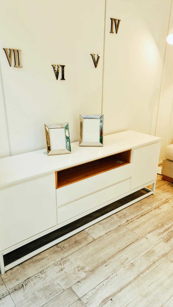 Mueble para tv realizado en mdf laqueado al poliretano con detalles de estante abierto en paraiso natural. Su base esta realizado en hierro con pintura a horno.